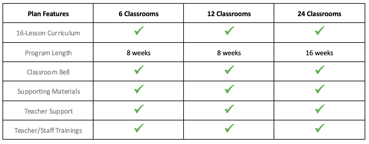 Three example plans are shown below, each based on a sixteen-lesson mindful-educator led curriculum. Along with the plans, a description of available plan features and an example schedule (for a 12-classroom plan) are provided.